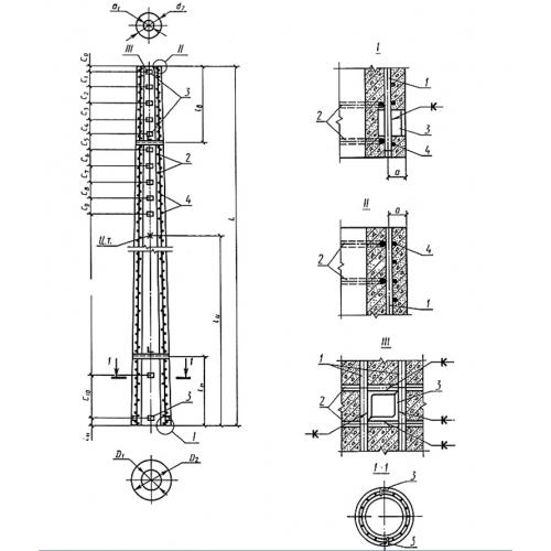 Обязательно все железобетонные элементы армирование сетками и каркасами из напряженной стали класса А-VI, A-V, A-IV, A-IVC, A-I и канаты К7 (в зависимости от типоразмера конической стойки) согласно ГОСТ 22687.1-85. Закладные изделия стойки располагаются следующим образом: С0 на 100 мм от края, далее С1-С9 через каждые 1000 мм., С10 – 3145 мм., С11 – 55 мм от нижнего края. В качестве армирования используют продольную арматуру и монтажные кольца. Также используют для поперечного армирования проволоку класса Вр-1, В-I. Вводится в тело стойки специальный заземляющий проводник в виде стержневой арматуры.